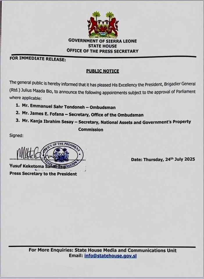 The announcement, made through an official government notice, also includes the appointment of Mr. James E. Fofana as Secretary in the Office of the Ombudsman, and Mr. Kanja Ibrahim Sesay as Secretary of the National Assets and Government’s Property Commission.