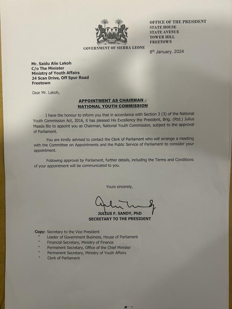 Lakoh’s appointment came in a letter dated 8th January 2024 which is by section 3 (3) of the National Youth Commission Act, 2016.