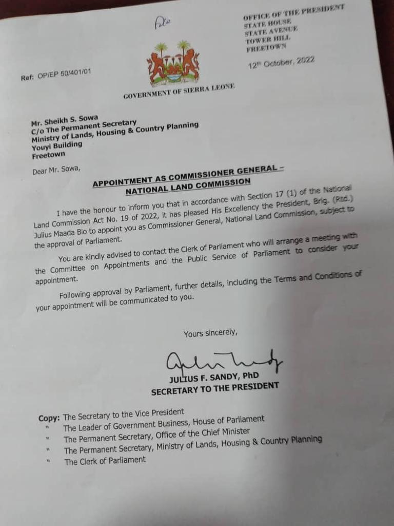 The president of Sierra Leone His Excellency Brig. (Rtd.) Julius Maada Bio has appointed Sheikh S. Sowa as the new commissioner General, of the National Land Commission.
