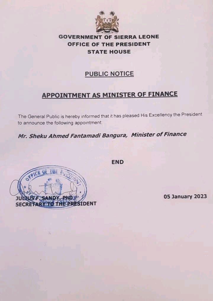 Sierra Leone’s President,  Dr Julius Maada Bio has today, the 5th January, 2023, appointed Sheku Fantamadi Bangura as Minister of Finance replacing Dennis Vandi.