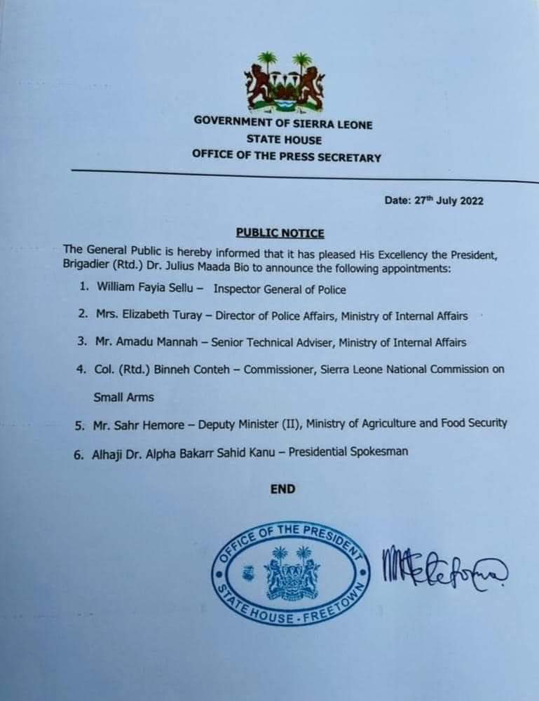 Sierra Leone’s President, Julius Maada Bio has today, Wednesday 27 July 2022 appointed William Fayia Sellu as the new Inspector General of Police.