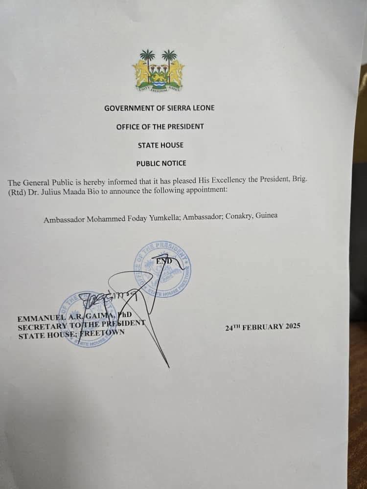 President Brigadier (Rtd) Dr. Julius Maada Bio has announced the appointment of Ambassador Mohammed Foday Yumkella as Sierra Leone’s new Ambassador to Conakry, Guinea.