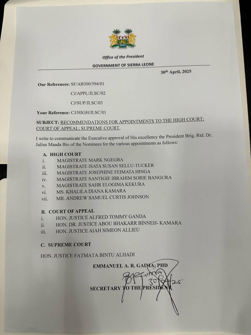 The President of Sierra Leone, Dr. Julius Maada Bio has officially approved a new slate of appointments to the High Court, Court of Appeal, and Supreme Court.