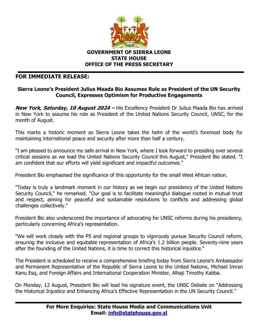 In a press statement, President Bio expressed his enthusiasm and optimism about the role. “I am honored to preside over the United Nations Security Council this August and am eager to lead discussions on pressing global issues,” President Bio said. “We aim to foster constructive dialogue and seek impactful solutions to international conflicts and challenges.”