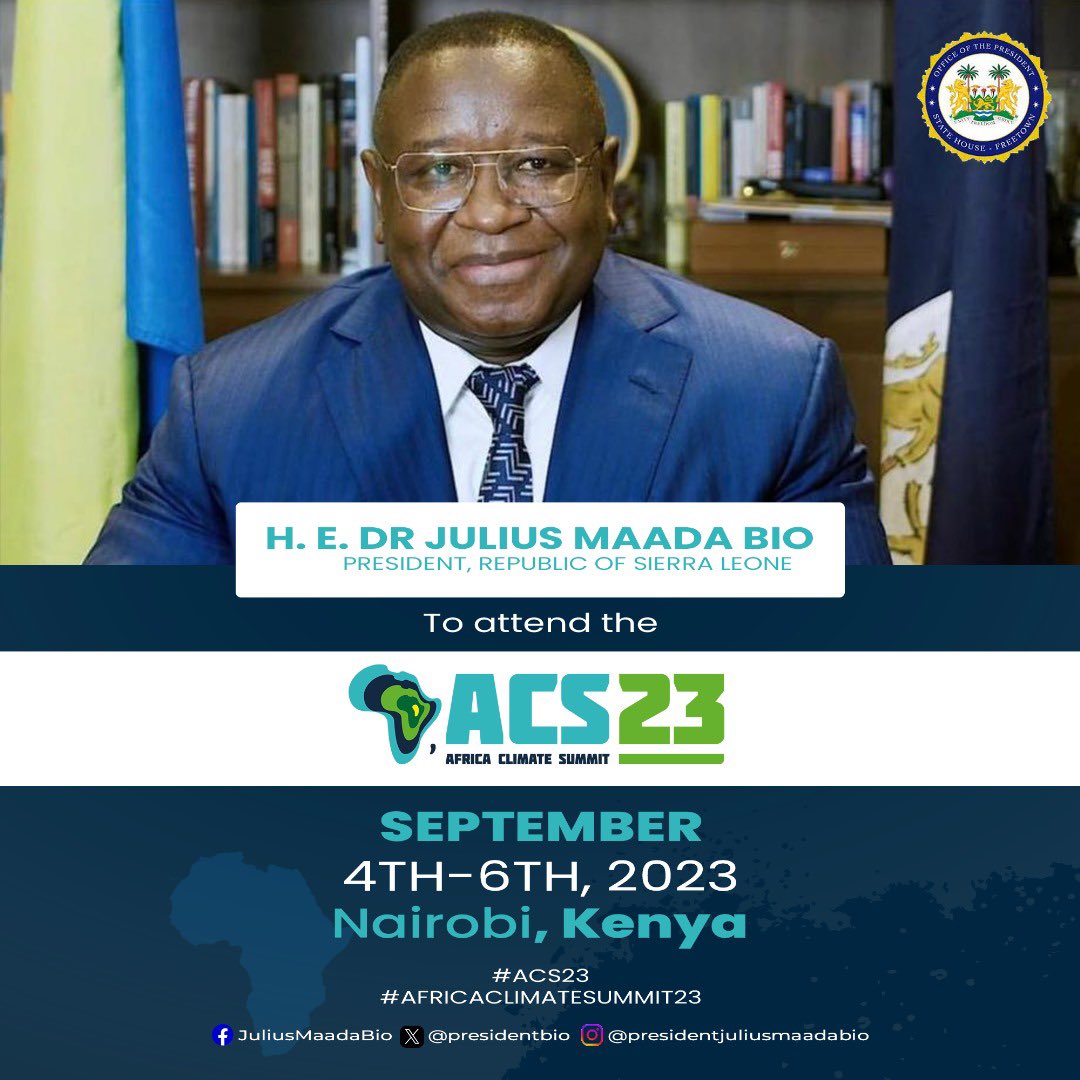 President Julius Maada Bio is set to depart Sierra Leone for Kenya today to attend the Africa Climate Summit ’23 under the theme: “Driving Green Growth and Climate Finance Solutions for Africa and the World”.