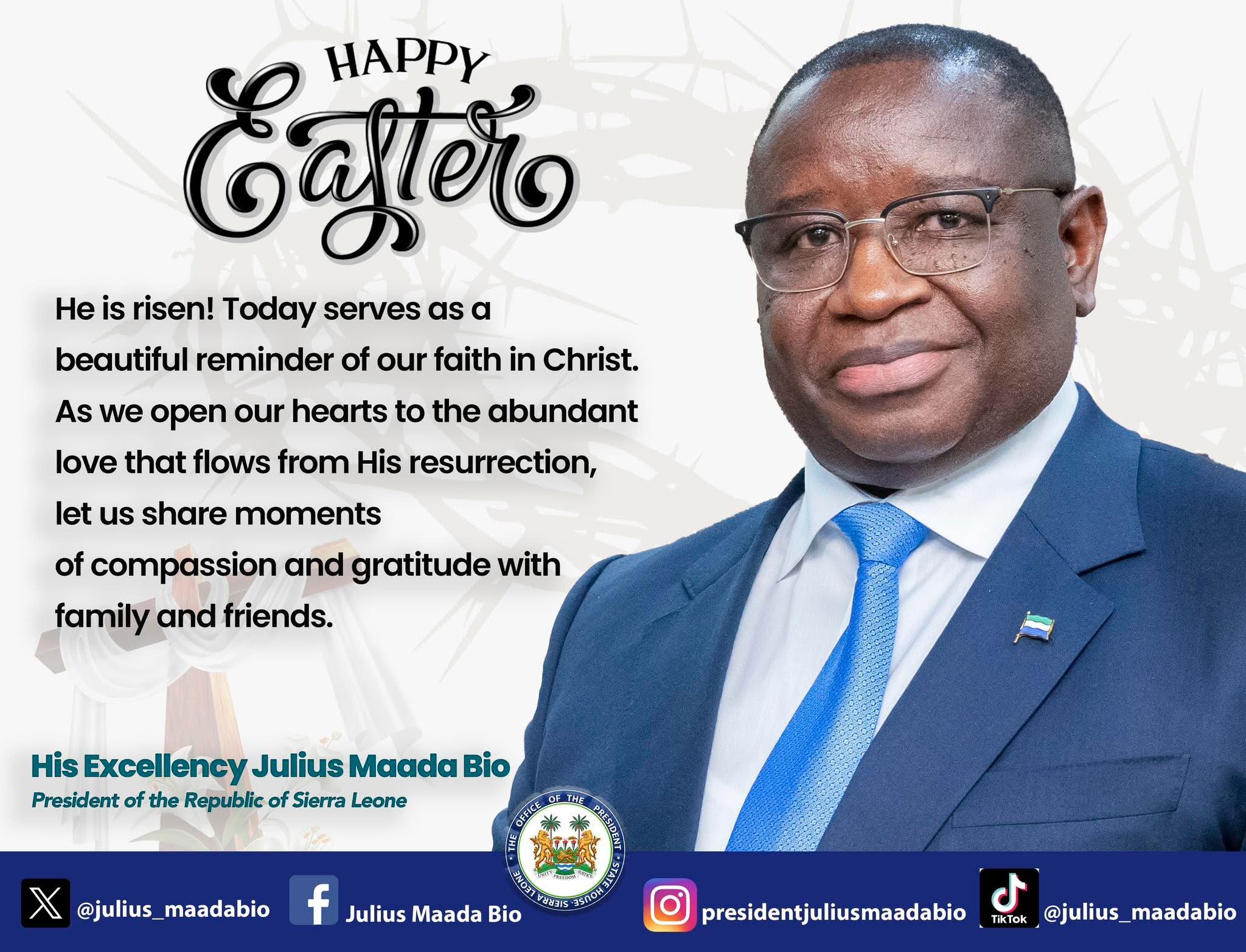 Sierra Leone President, Julius Maada Bio has called on Sierra Leoneans to express compassion and unity as they celebrate Easter this 2025.