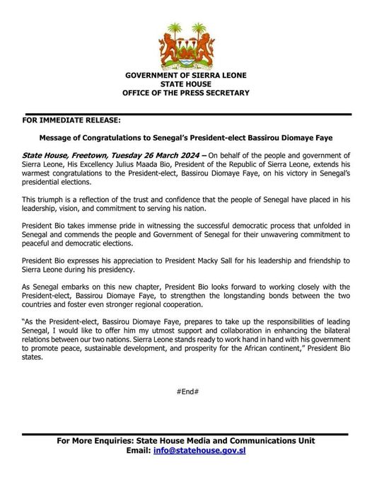 “As the President-elect, Bassirou Diomaye Faye, prepares to take up the responsibilities of leading Senegal, I would like to offer him my utmost support and collaboration in enhancing the bilateral relations between our two nations. Sierra Leone stands ready to work hand in hand with his government to promote peace, sustainable development, and prosperity for the African continent,” President Bio stated.
