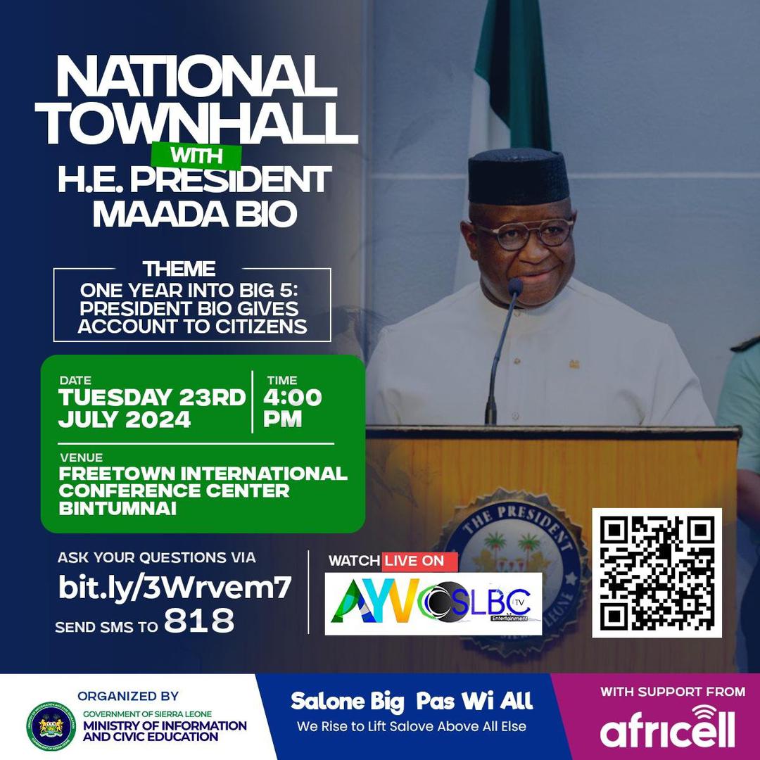 The Ministry of Information and Civic Education has announced the presence of the H.E President Julius Maada Bio of the republic of Sierra Leone at a national town hall, which will be hosted at the Africa Young Voices, the Sierra Leone Broadcasting Cooperation and other media platforms in the country.
