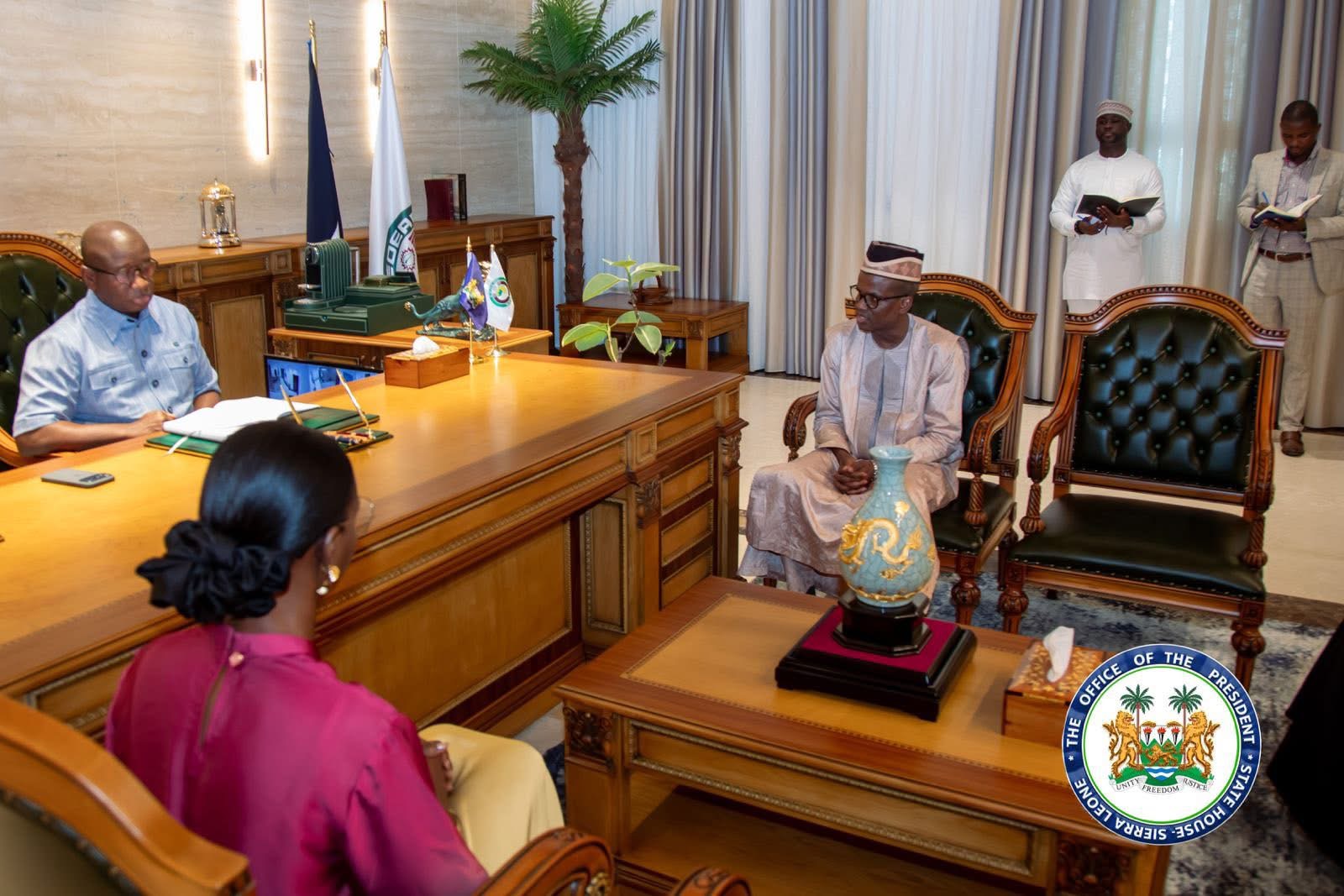 President Julius Maada Bio on Monday, January 12, 2026, officially bade farewell to the outgoing Chief Executive Officer of Orange Sierra Leone, Sekou Amadou Bah, and welcomed the company’s new Chief Executive Officer, Madam Aicha Toure, during a courtesy visit at State House.