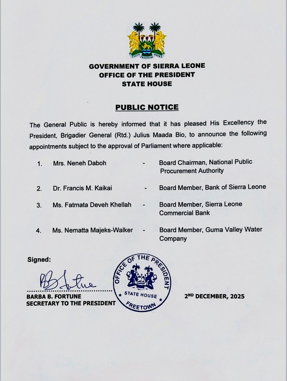 The President’s announcement underscores his administration’s continued focus on strengthening governance and institutional oversight across critical sectors of Sierra Leone’s public service.