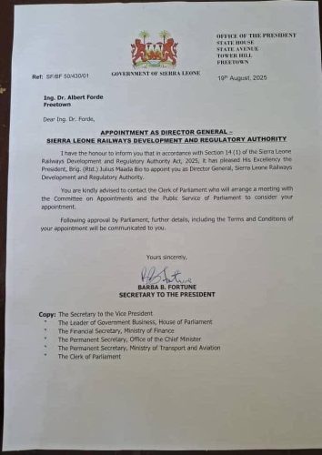 The appointment, conveyed in an official letter from the Office of the President dated 19th August 2025, was made in accordance with Section 14 (1) of the Sierra Leone Railways Development and Regulatory Authority Act, 2025.