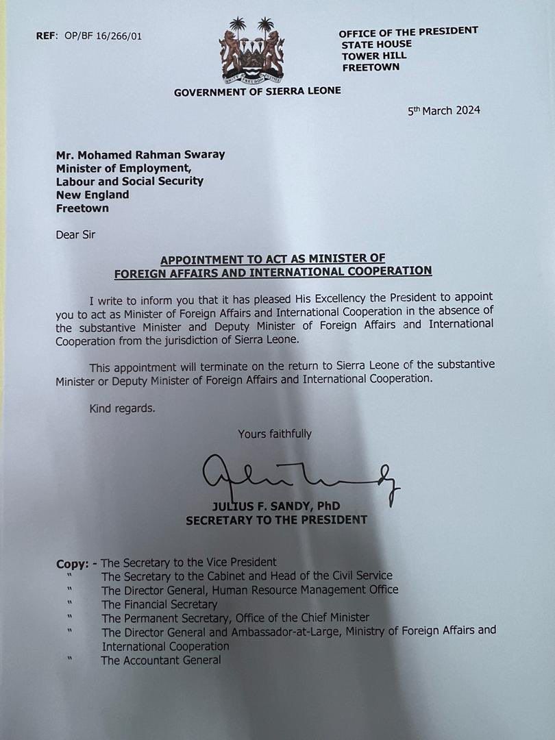 “I write to inform you that it has pleased His Excellency the President to appoint you to act as Minister of Foreign Affairs and International Cooperation in the absence of the substantive Minister and Deputy Minister of Foreign Affairs and International Cooperation from the jurisdiction of Sierra Leone.