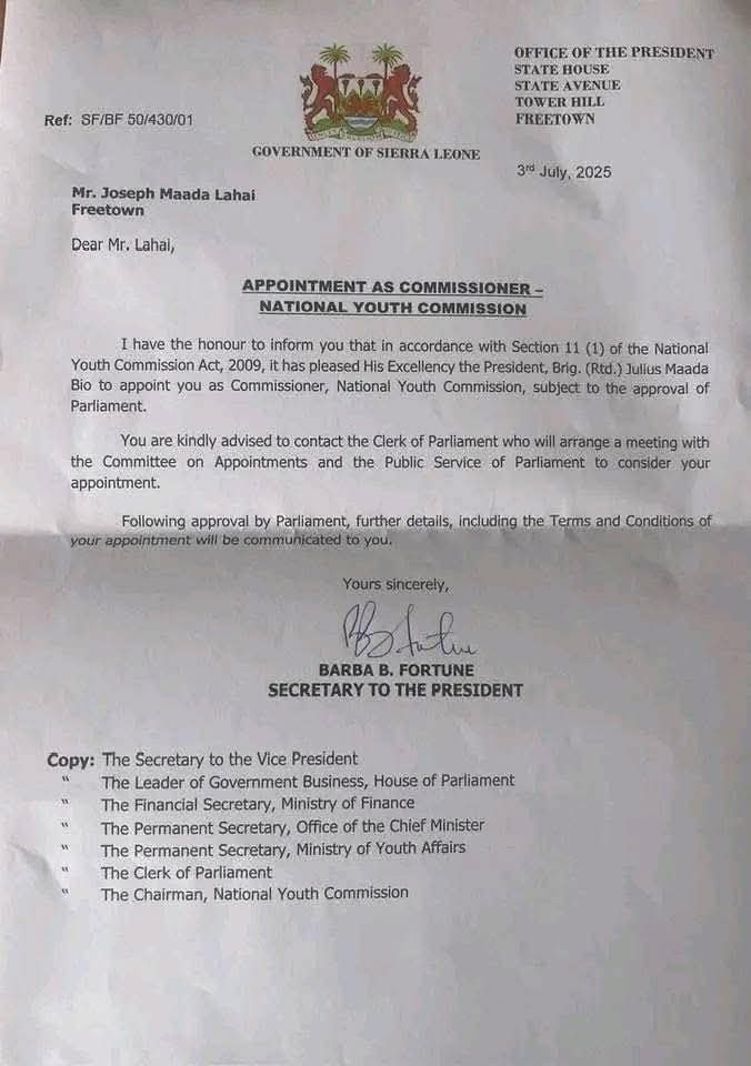 His Excellency President Brig. (Rtd.) Julius Maada Bio has appointed Mr. Joseph Maada Lahai as the new Commissioner of the National Youth Commission (NaYCOM), in accordance with Section 11(1) of the National Youth Commission Act, 2009.