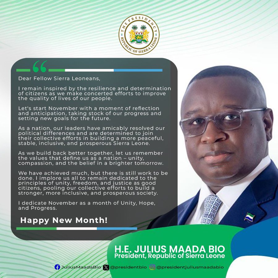 Sierra Leone President Julius Maada Bio has delivered a new month message to Sierra Leoneans as we enter into the month of November.