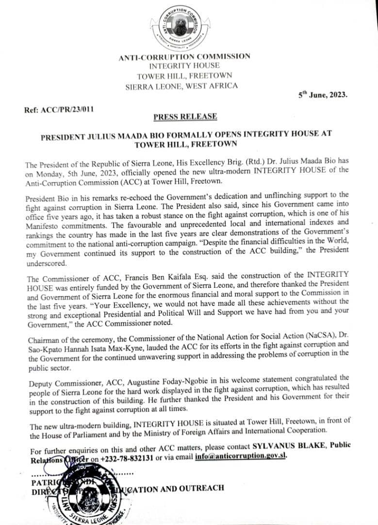 The President of the Republic of Sierra Leone, Julius Maada Bio has on Monday, 5th June, 2023, officially opened the new ultra-modern INTEGRITY HOUSE of the Anti-Corruption Commission (ACC) at Tower Hill, Freetown.