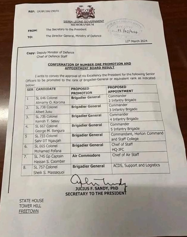 President Julius Maada Bio has granted approval for the promotion of eight senior officers within the Sierra Leone Armed Forces. Notably, seven of these officers have been elevated to the prestigious rank of Brigadier-General.
