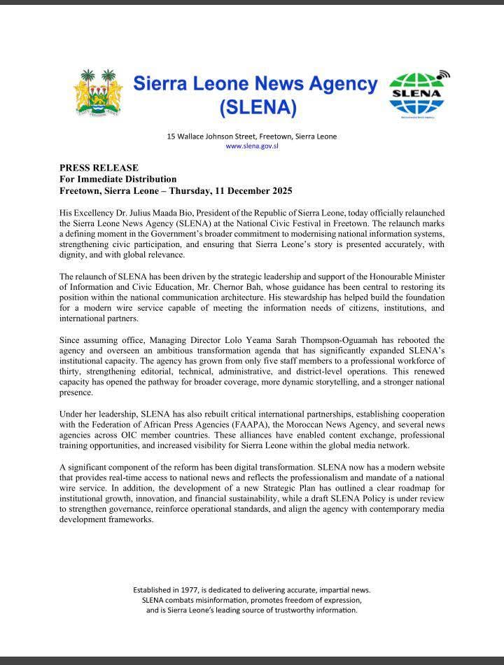 Also, a press release was issued by Sierra Leone News Agency (SLENA). The relaunch is the culmination of an ambitious transformation agenda spearheaded by Managing Director Lolo Yeama Sarah Thompson-Oguamah, who has successfully rebooted the agency.