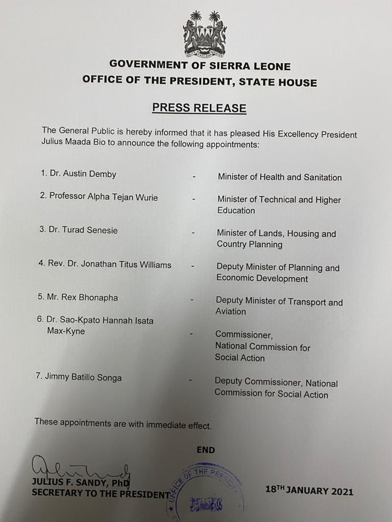 “The General Public is hereby informed that it has pleased His Excellency President Julius Maada Bio to announce the following appointments: