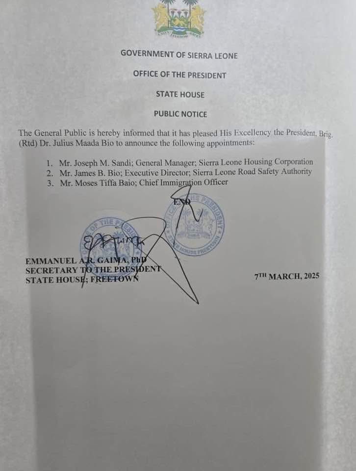 In a statement issued by the Office of the President, His Excellency Brig. (Rtd) Dr. Julius Maada Bio approved the appointments of Mr. Moses Tiffa Baio as Chief Immigration Officer