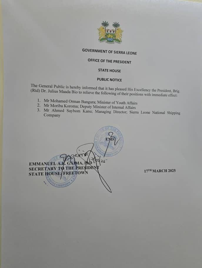President Julius Maada Bio of Sierra Leone has dismissed three high-ranking officials from their positions, according to a public notice issued by the Office of the President.