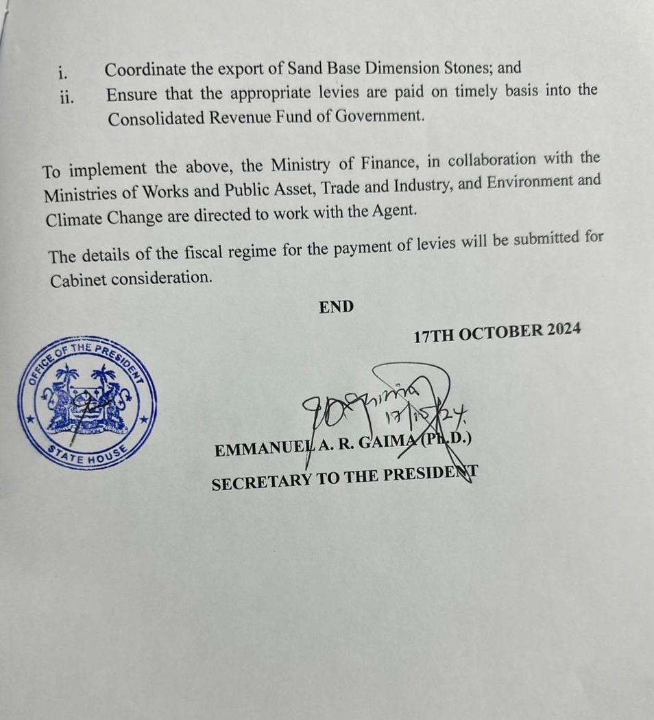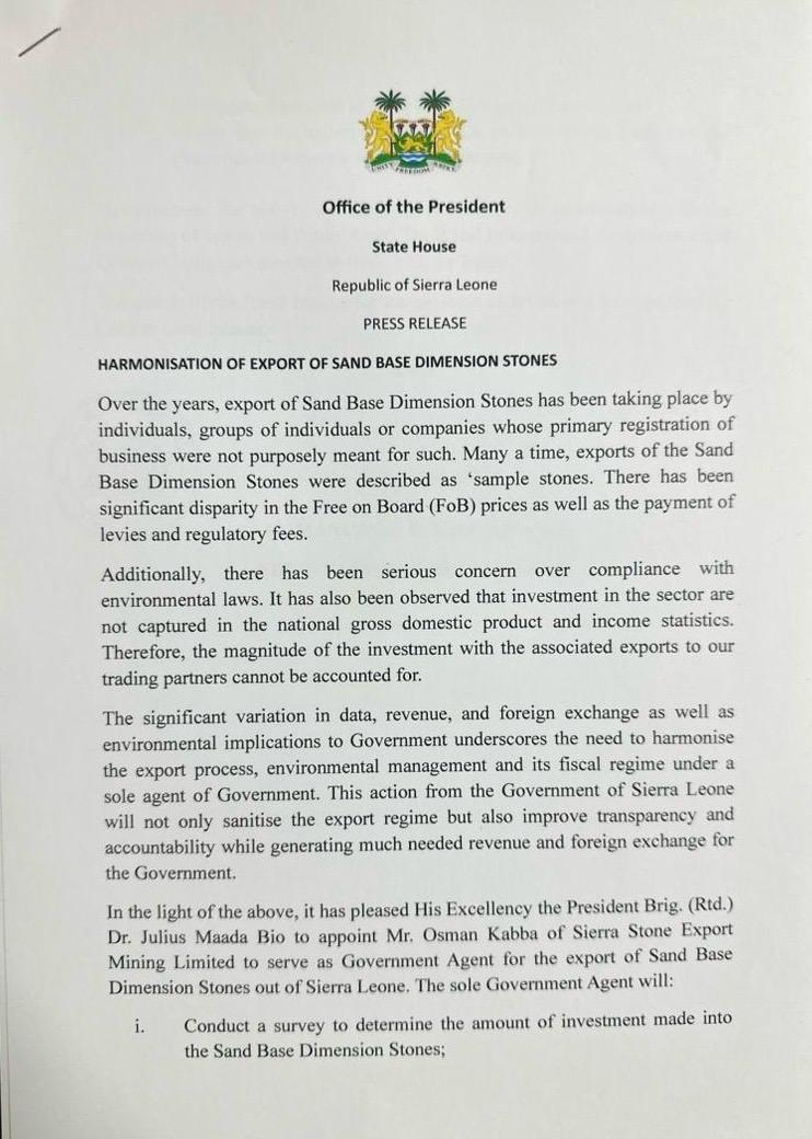 In a significant move aimed at addressing irregularities in the export of Sand Base Dimension Stones, the Government of Sierra Leone, through the Office of the President, has announced the appointment of Mr. Osman Kabba of Sierra Stone Export Mining Limited as the sole government agent responsible for overseeing the export process.