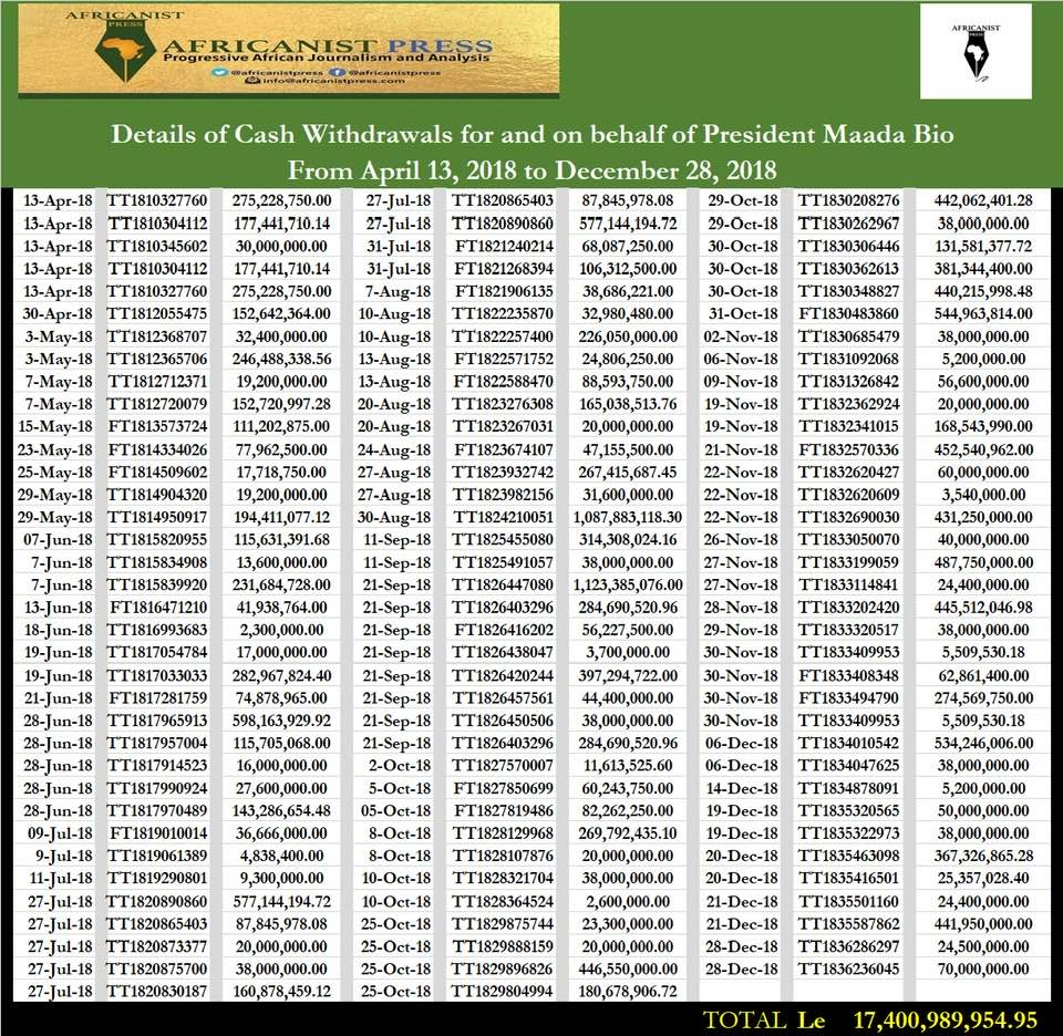 Thus, BSL records on financial transactions of the Office of the President show that both President Maada Bio and First Lady Fatima Bio collectively withdrew in foreign and local currencies a combined cash amount of Le23,852,191,910.72 (about US$2.4 million) between his inauguration in May 2018 and December 2018 for unspecified personal use. These amounts listed do not include other withdrawal transactions from the Accounts of the Office of the First Lady and the General Expenditure Accounts of the Office of the President.