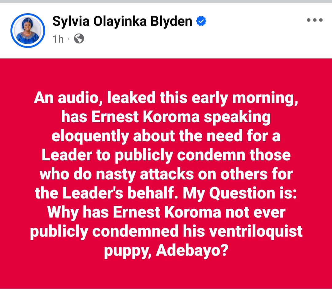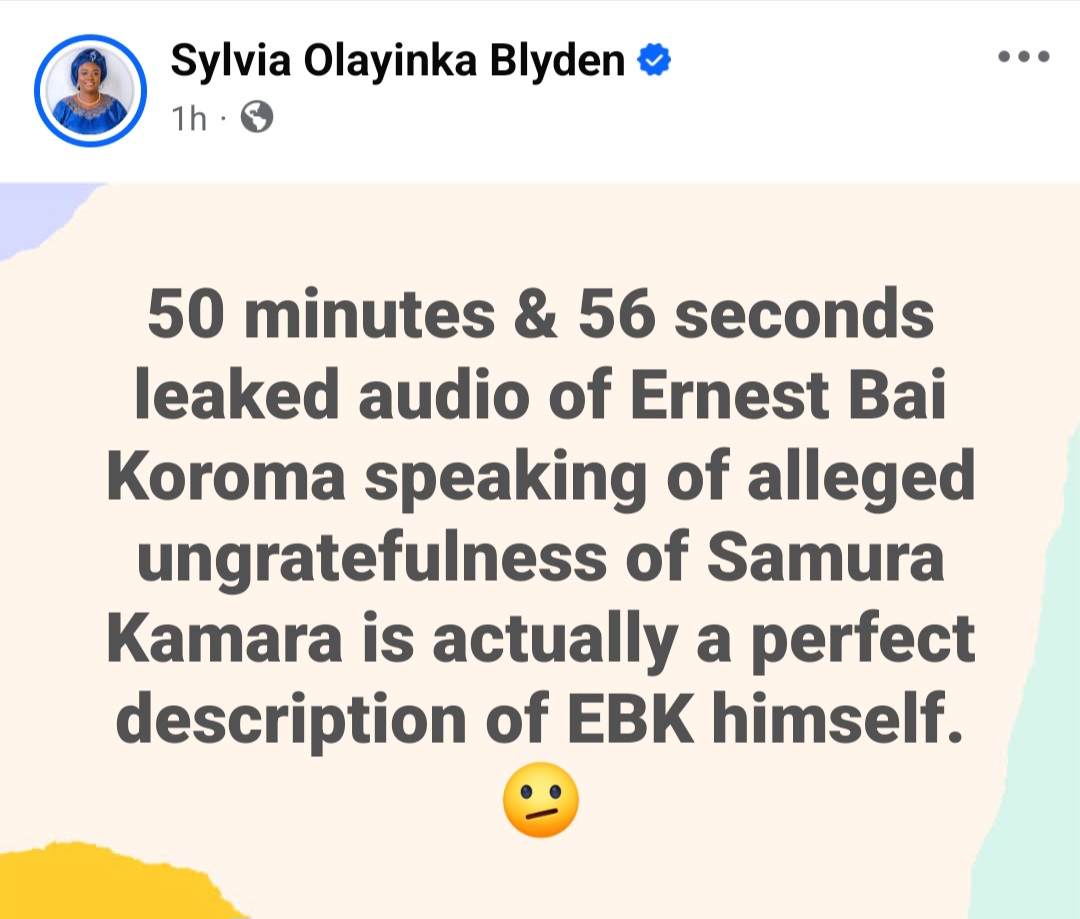 Dr. Sylvia Olayinka Blyden a political commentator and former government official, posted on her Facebook platform this morning about a leaked audio she said she listened to.