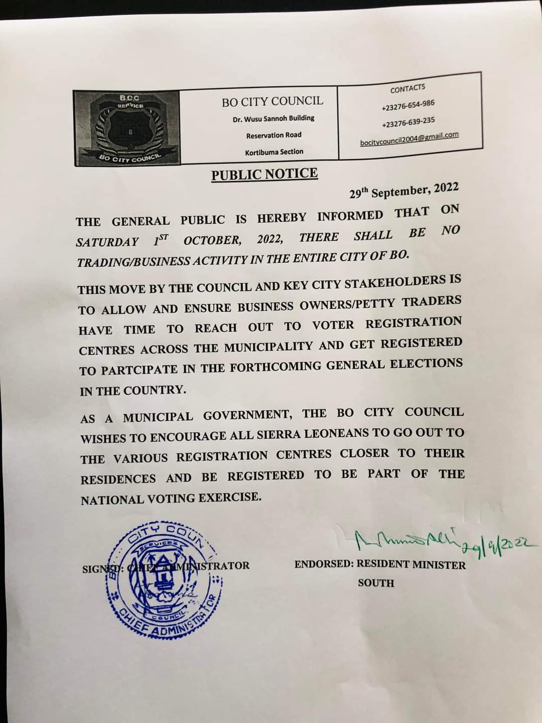 “The general public is hereby informed that on Saturday 1st october, 2022, there shall be no trading/business activity in the entire city of Bo.