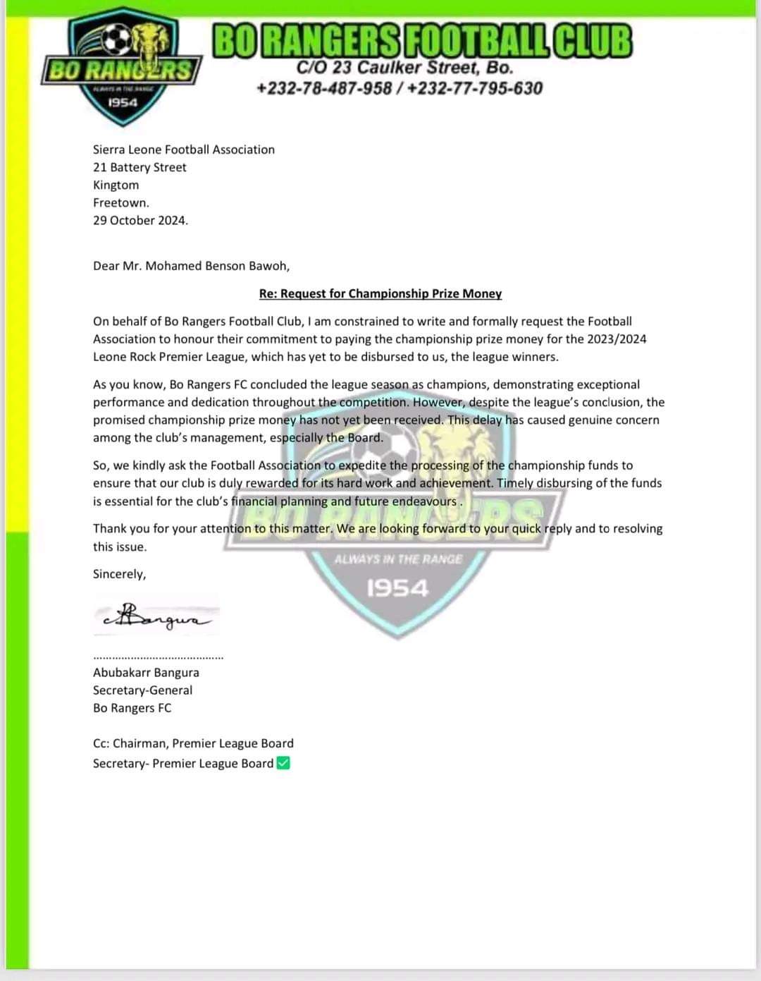 Bo Rangers Football Club formally calls on the Sierra Leone Football Association (SLFA) to disburse the pending championship funds owed to the team.