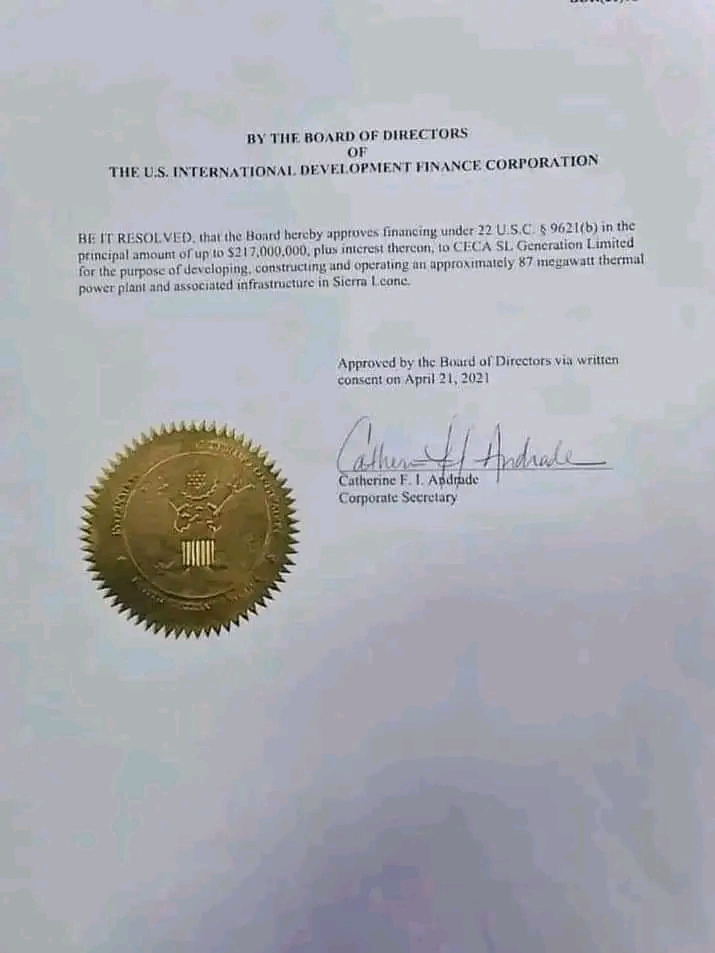 The Board of Directors of the US International Development Corporation has approved $217, 000, 000 to the government of Sierra Leone for the development of the energy sector.