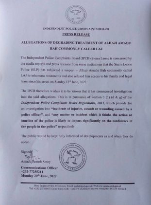 “The Independent Police Complaints Board (IPCB) Sierra Leone is concerned by the media reports and press releases from some institutions that the Sierra Leone Police (SLP) has subjected a suspect – Alhaji Amadu Bah commonly called LAJ to inhumane treatments and also refused him access to his family and legal team since his arrest on Sunday 12th June, 2022.