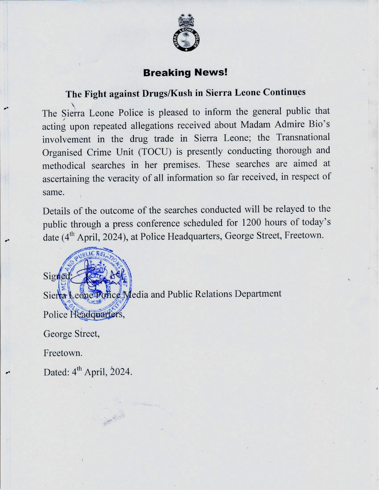 The notice underscores the commitment of law enforcement agencies to combat drug-related activities in Sierra Leone. The ongoing searches aim to thoroughly investigate the allegations against Madam Admire Bio and verify the accuracy of the information received thus far.