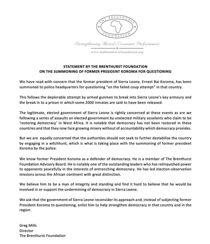 The Brenthurst Foundation has expressed concern about the ongoing questioning of former Sierra Leonean President Ernest Bai Koroma by the Criminal Investigation Department (CID) in connection with the November 26th attempted coup.