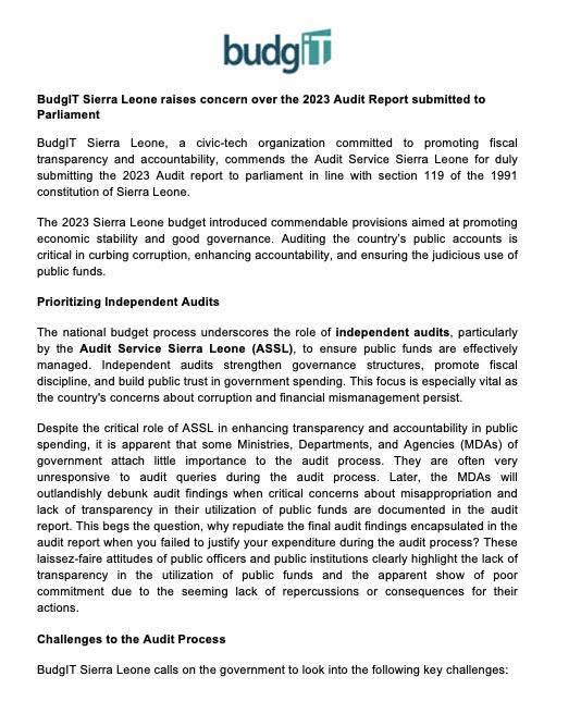 BudgIT Sierra Leone is a civic-tech organization dedicated to promoting fiscal transparency and accountability. In a press release issued on January 27, the organization commended the Audit Service Sierra Leone for submitting the 2023 Audit report to parliament in accordance with section 119 of the 1991 constitution of Sierra Leone.