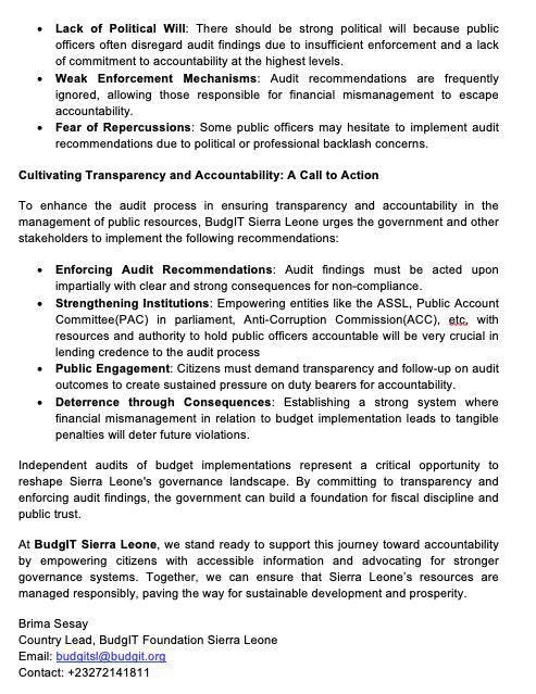 To improve the audit process and ensure transparency and accountability in the management of public resources, BudgIT Sierra Leone calls on the government and other stakeholders to implement the following recommendations: