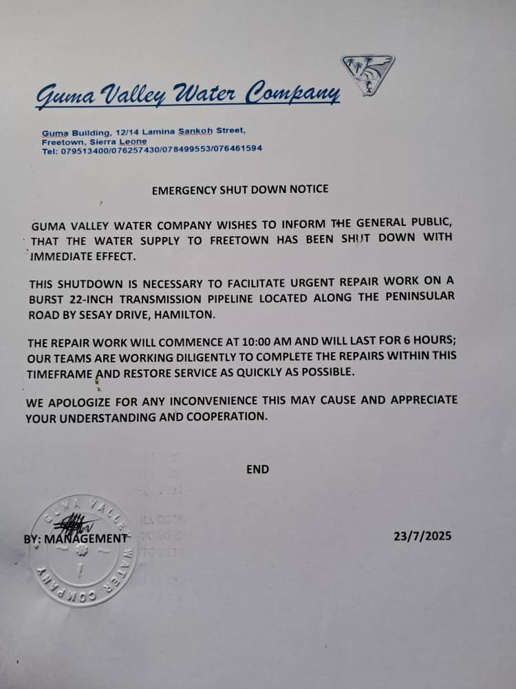 Residents of Freetown are experiencing a temporary water supply shutdown today, July 23, 2025, following a technical issue with a main transmission pipe.