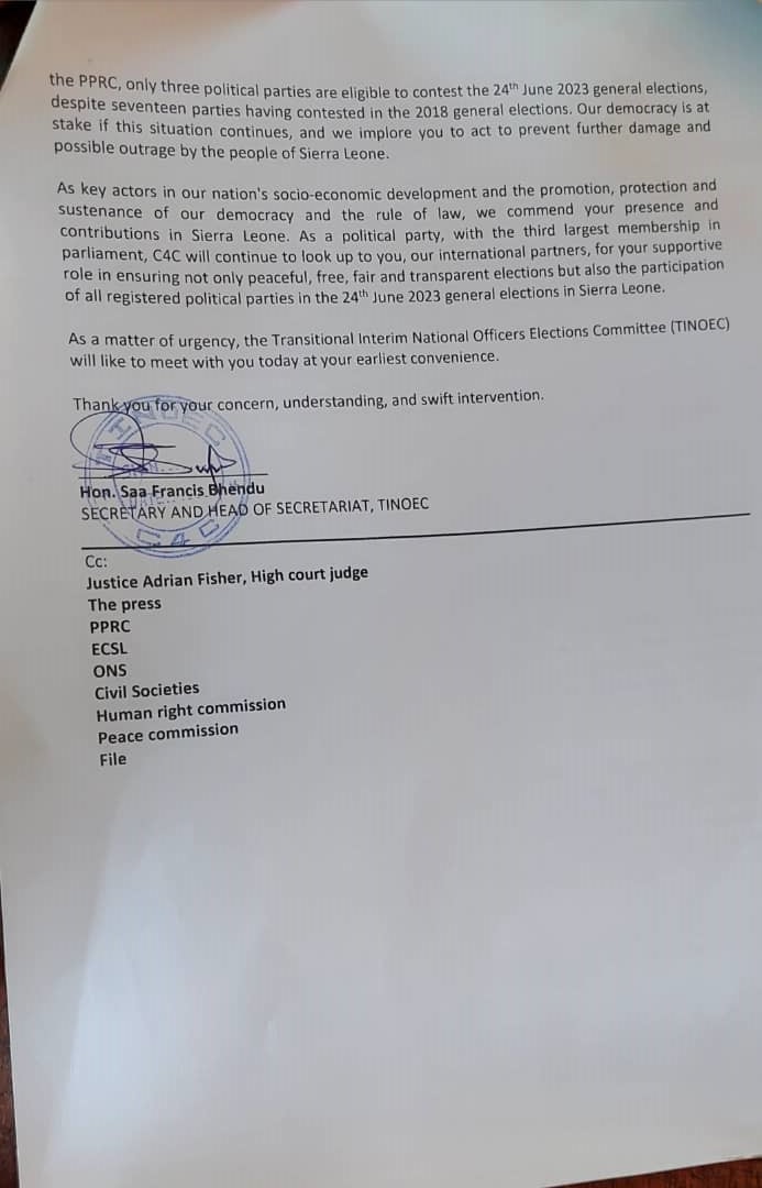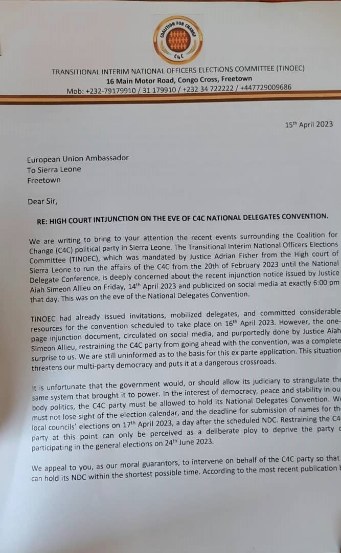 “We are writing to bring to your attention the recent events surrounding the Coalition for Change (C4C) political party in Sierra Leone. The Transitional Interim National Officers Elections Committee (TINOEC), which was mandated by Justice Adrian Fisher from the High court of Sierra Leone to run the affairs of the C4C from the 20th of February 2023 until the National Delegate Conference, is deeply concerned about the recent injunction notice issued by Justice Aiah Simeon Allieu on Friday, 14th April 2023 and publicized on social media at exactly 6:00 pm that day. This was on the eve of the National Delegates Convention.