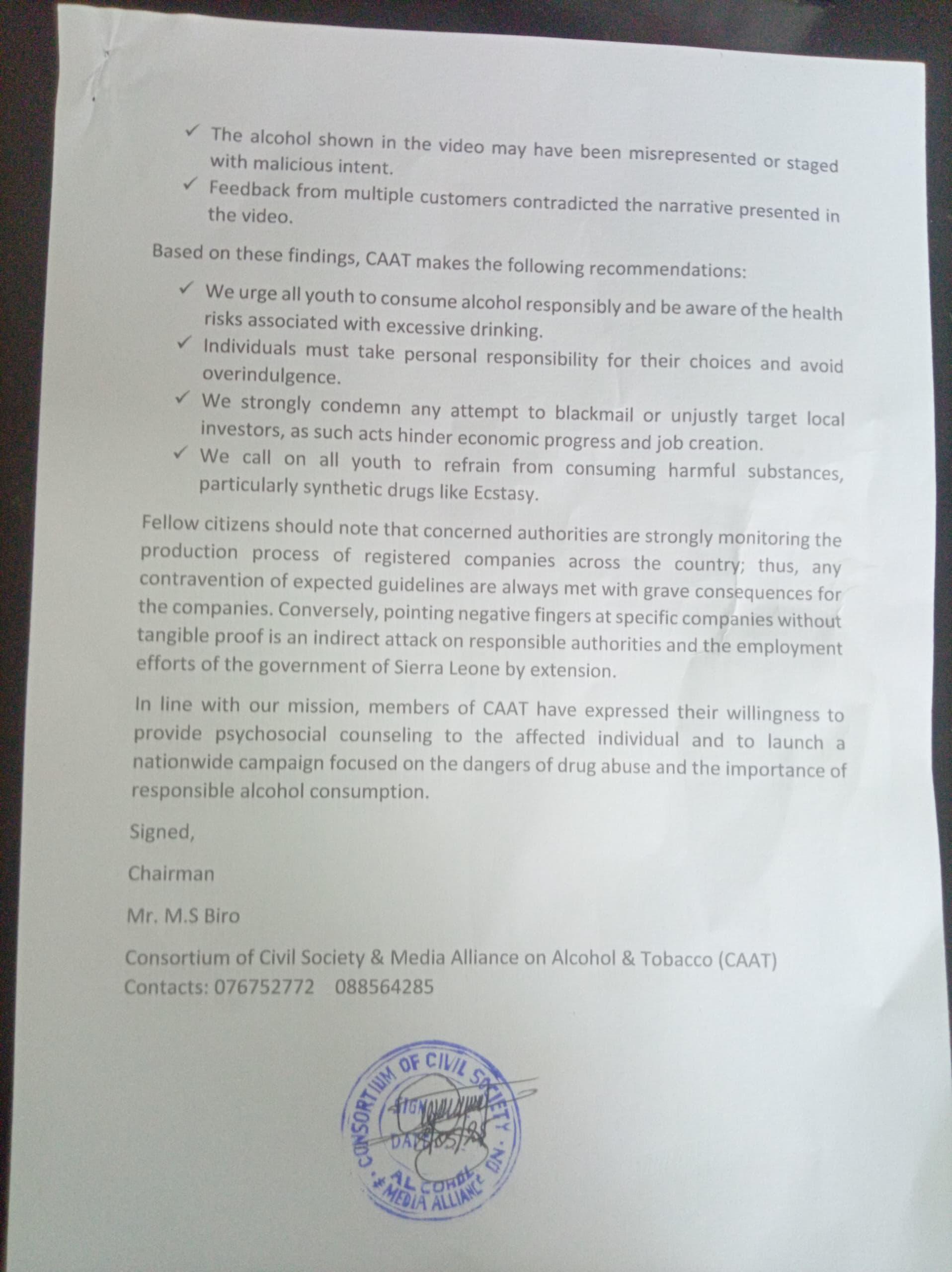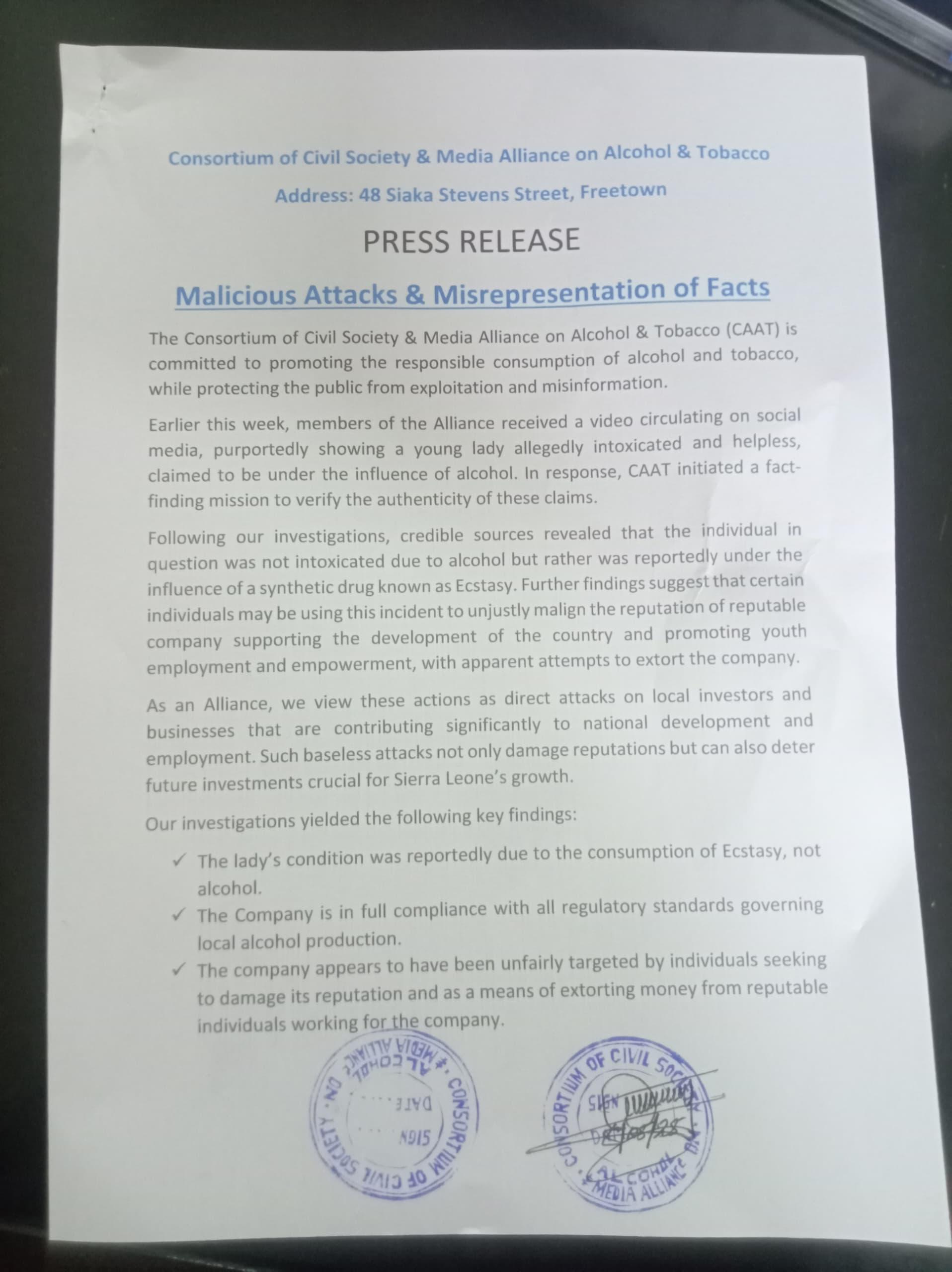 CAAT firmly condemned what it described as a malicious attempt to misrepresent facts and damage the reputation of a reputable company in Sierra Leone’s alcohol industry. The statement emphasized the importance of promoting responsible alcohol consumption while protecting the public from misinformation.