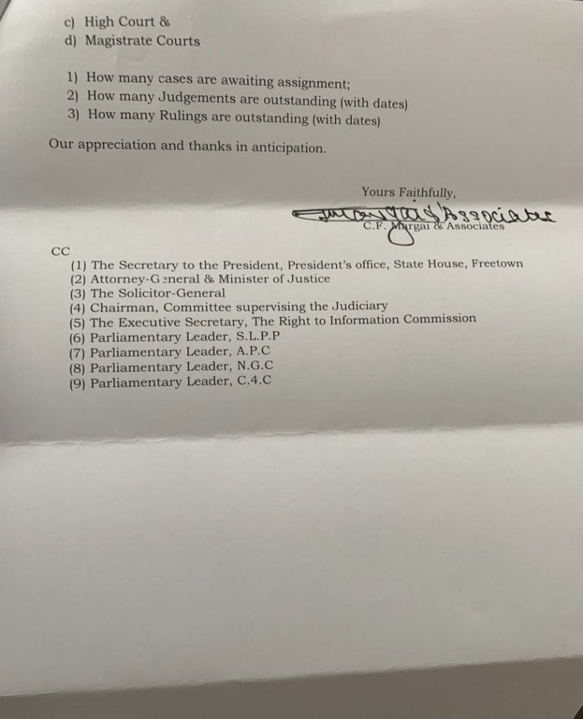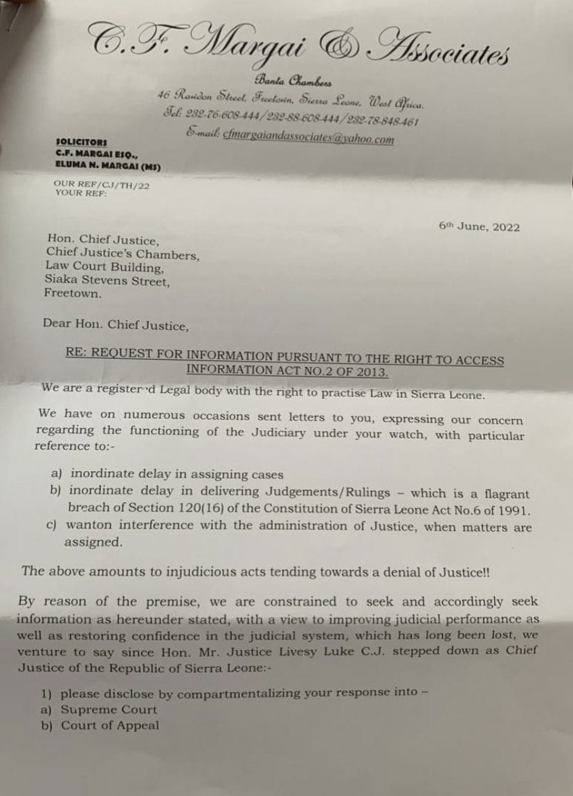 Renowned Lawyer Charles Francis Margai and Associates has in a letter to the chief justice complain about inordinate delay in assigning cases and delivering justice, he describes the two issues as “injudicious acts tending towards a denial of justice!”.