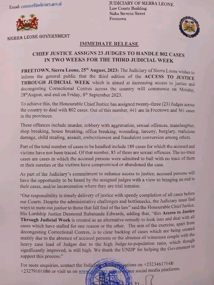 In a press release the Judiciary of Sierra Leone announced to the general public that the third edition of the ACCESS TO JUSTICE THROUGH JUDICIAL WEEK which is aimed at increasing access to justice and decongesting Correctional Centres across the country will commence on Monday 28th August, and end on Friday, 8th September 2023. They said, “To achieve this. the Honourable Chief Justice has assigned twenty-three (23) Judges across the country to deal with 802 cases. Out of this number, 441 are in Freetown, and 361 cases and in the provinces. These offenses include murder, robbery with aggravation, sexual offenses, manslaughter, shop breaking, housebreaking, office breaking, wounding, larceny, burglary, malicious damage, child stealing, assault, embezzlement, and fraudulent conversion among others.”