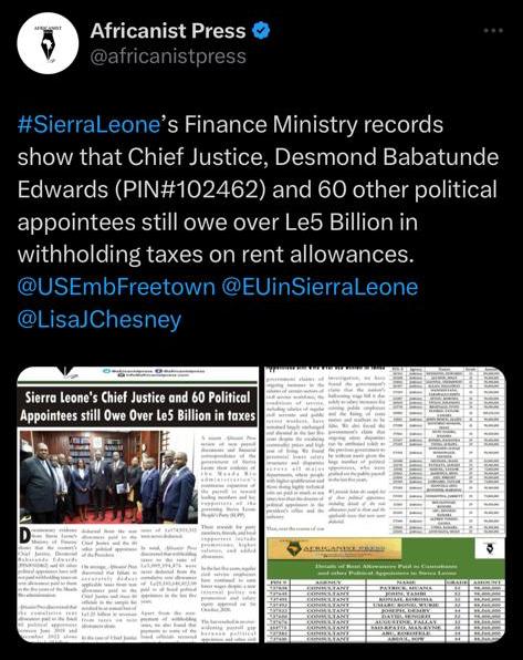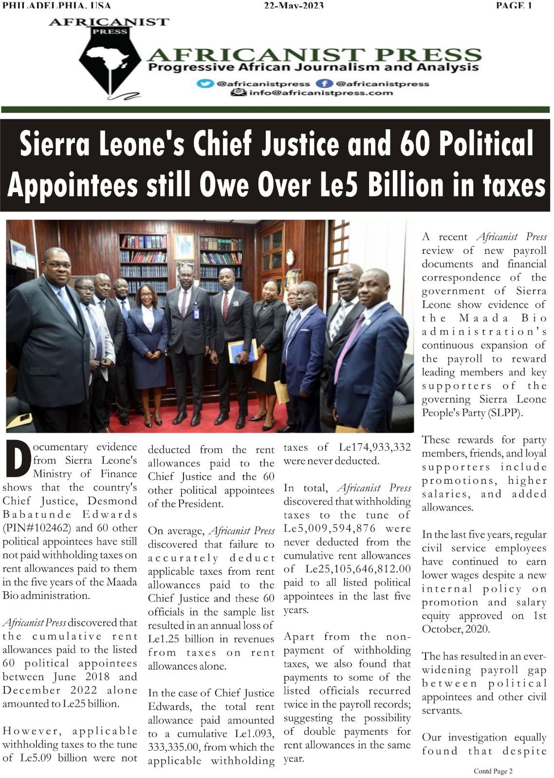 Documentary evidence from Sierra Leone’s Ministry of Finance shows that the country’s Chief Justice, Desmond Babatunde Edwards (PIN#102462) and 60 other political appointees have still not paid withholding taxes on rent allowances paid to them in the five years of the Maada Bio administration.