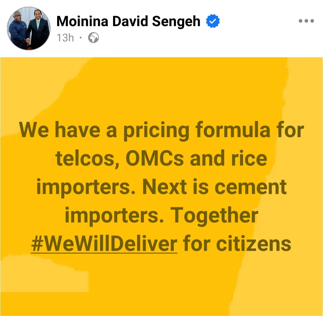 Sengeh took to social media to share the news, saying, “We have a pricing formula for telcos, OMCs, and rice importers. Next is cement importers. Together #WeWillDeliver for citizens.”