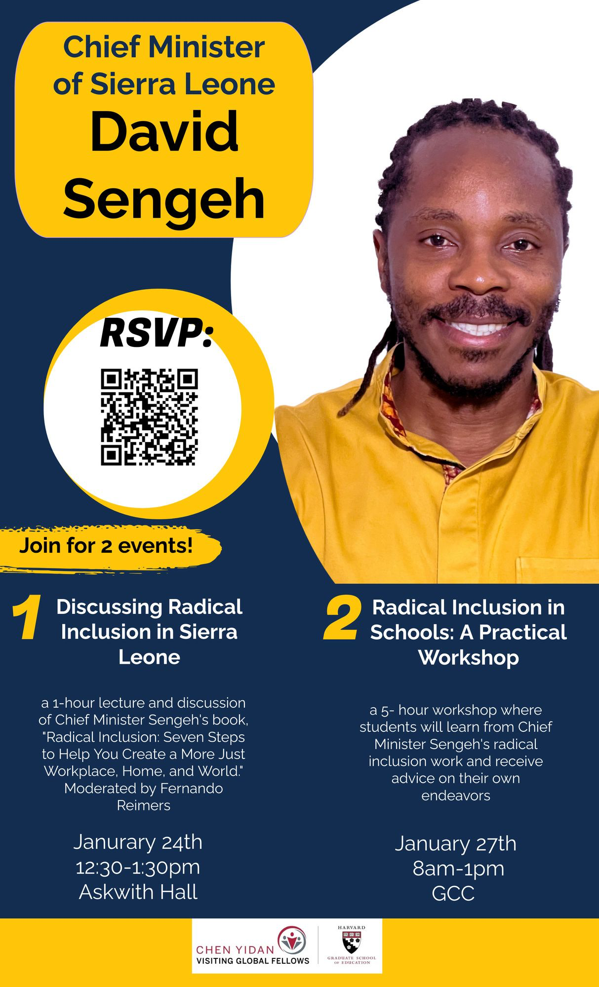 The scheduled events promise enriching insights into Chief Minister Sengeh’s expertise, particularly through a one-hour lecture and discussion focused on his book, “Radical Inclusion: Seven Steps to Help You Create a More Just Workplace, Home, and World.” The lecture, moderated by Fernando Reimers, is set to take place on January 24th, 2024, from 12:30-1:30 pm at Askwith Hall.