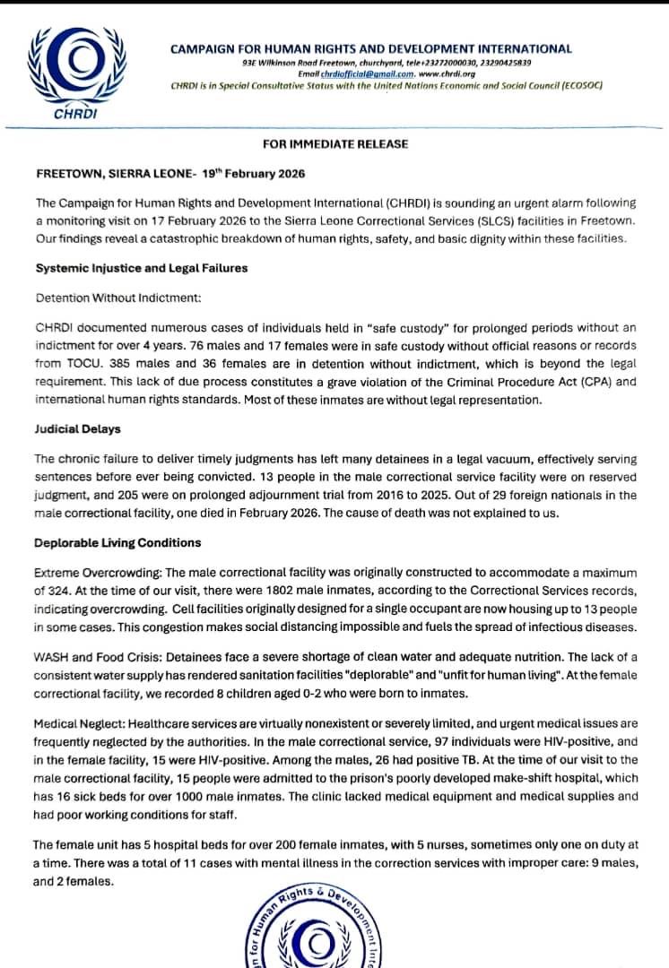 In a press statement issued on 19 February 2026, CHRDI detailed findings from visits to facilities operated by the Sierra Leone Correctional Services (SLCS), highlighting systemic legal failures, severe overcrowding, medical neglect, and collapsing security infrastructure.