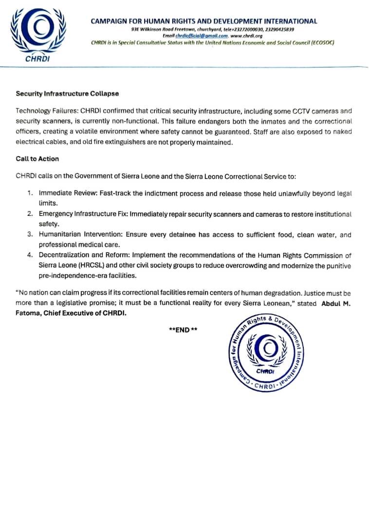 The Campaign for Human Rights and Development International (CHRDI) has raised serious concerns over what it describes as a “catastrophic breakdown of human rights, safety, and basic dignity” at correctional facilities in Freetown following a monitoring visit conducted on 17 February 2026.