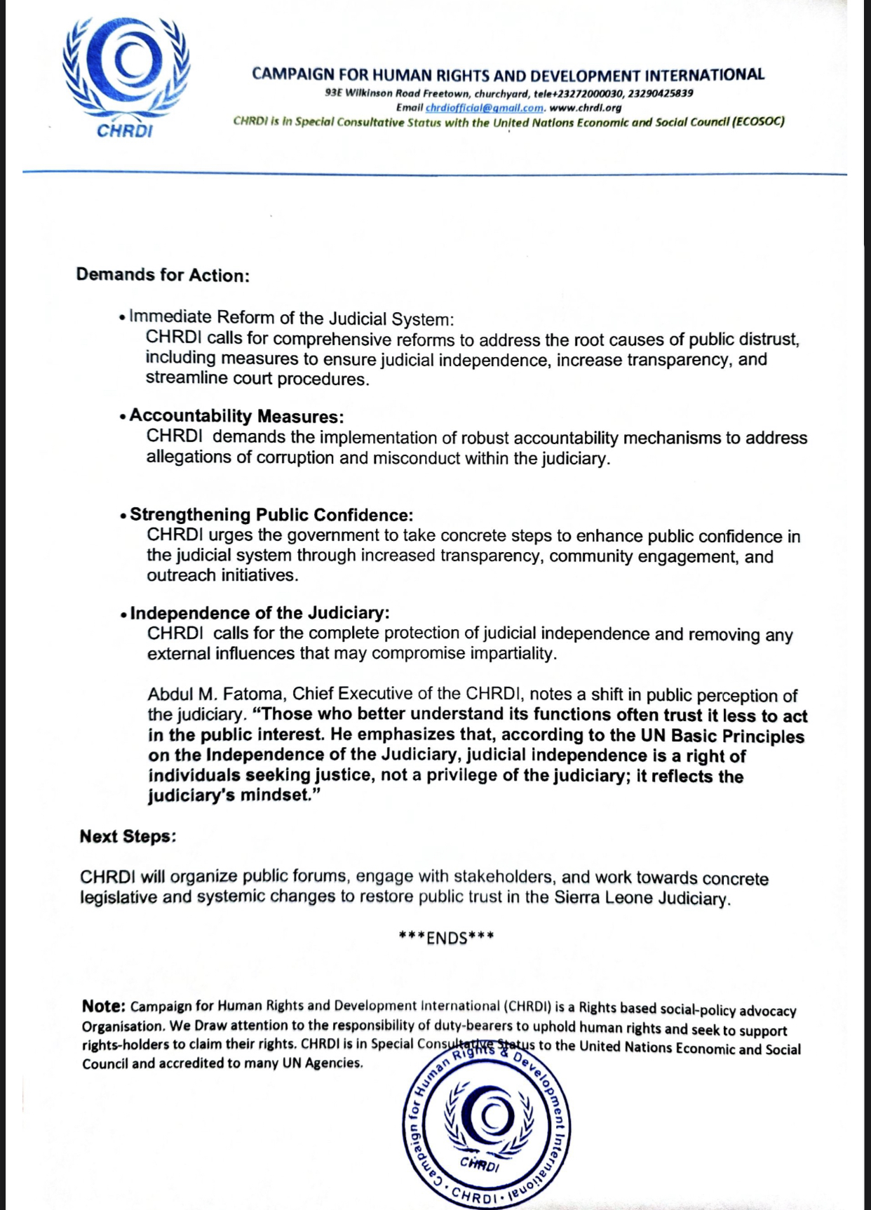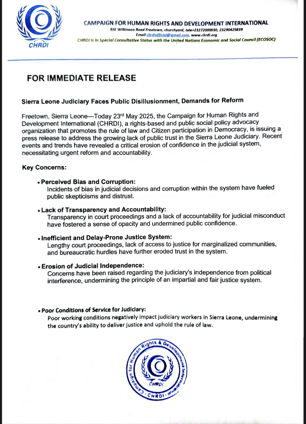 The Campaign for Human Rights and Development International (CHRDI), a rights-based organization, has issued a press release expressing deep concerns regarding the declining public trust in the judiciary of Sierra Leone.