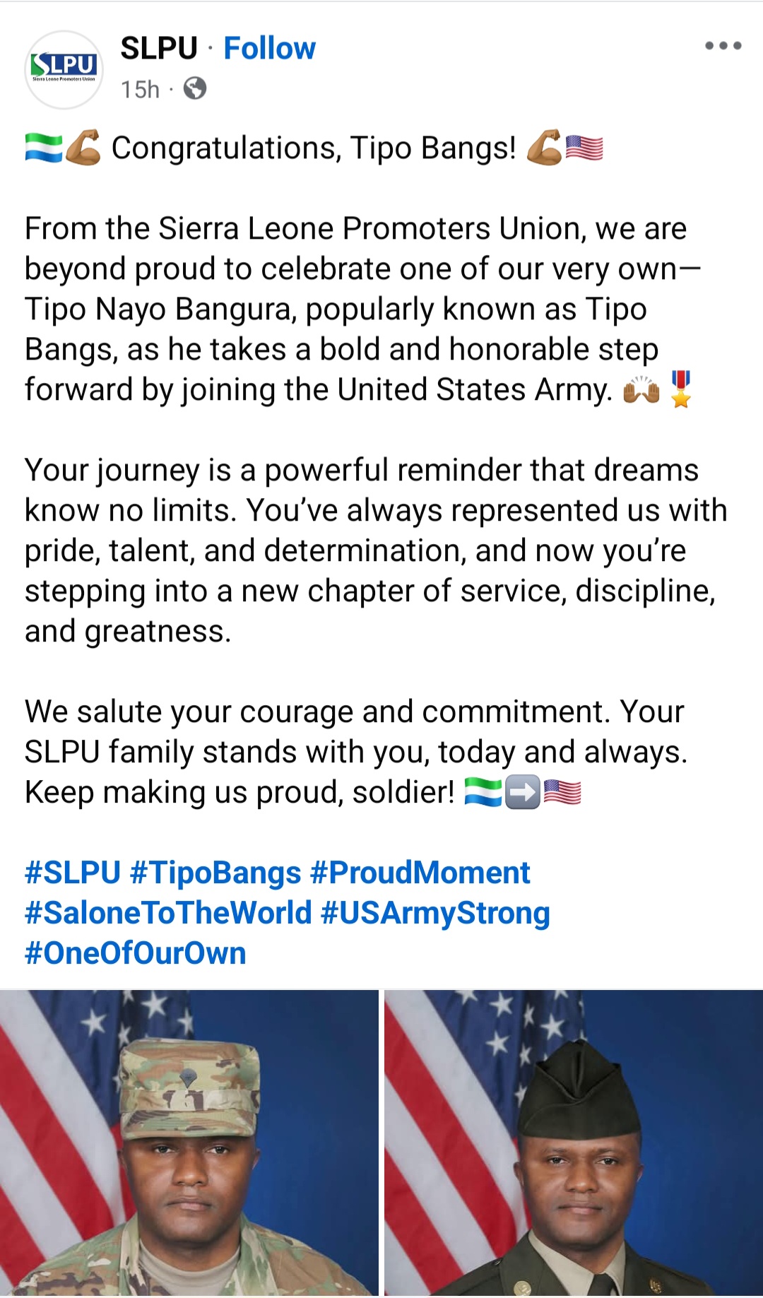 Christian Lahai Bangura Joins US Army (Tipo Nayo Bangs), a Sierra Leonean citizen and entertainment promoter, has officially joined the United States Army.