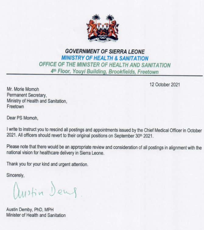 In a letter dated 23th October, 2021, the Minister of Health, instructed the Permanent Secretary to “rescind all postings and appointments by the Chief Medical Officer in October 2021,” adding that “all officers should revert to their original positions on September 30th 2021.” He stated further in his letter that “there would be an appropriate review and consideration of all postings in alignment with the national vision for healthcare delivery in Sierra Leone.”