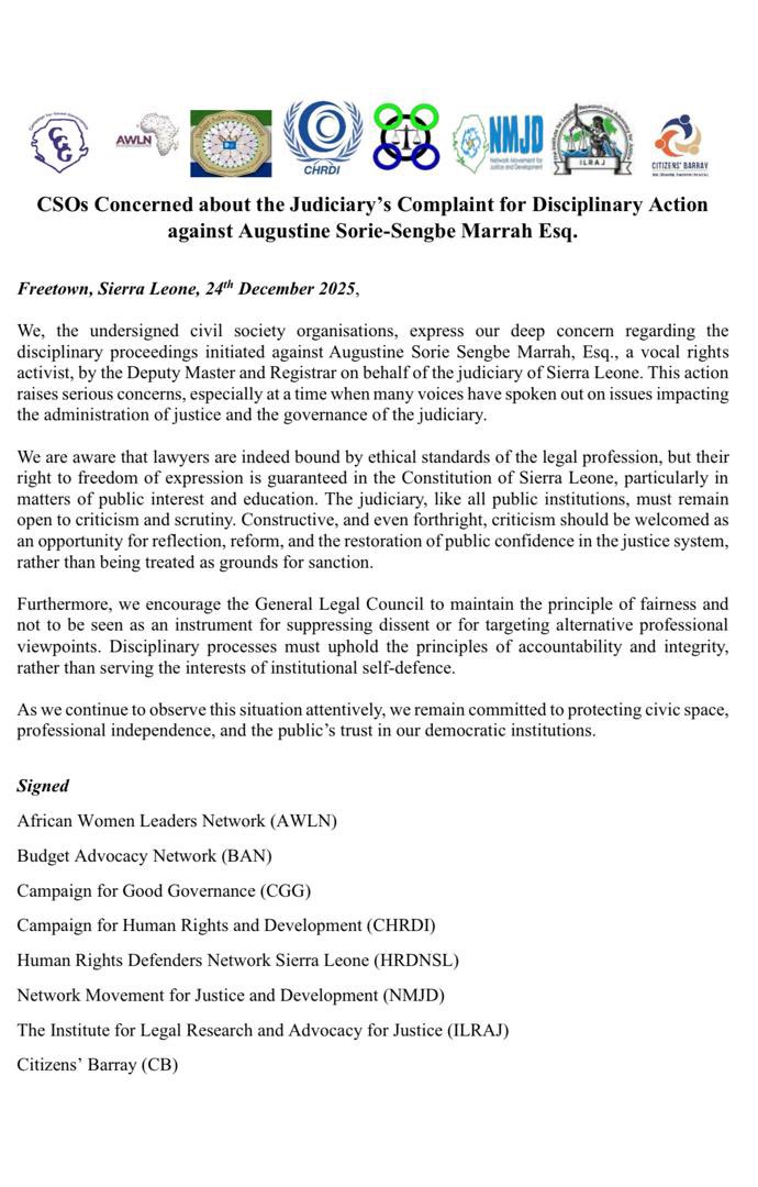 A coalition of leading civil society organizations (CSOs) has publicly criticized the judiciary’s decision to pursue disciplinary action against outspoken lawyer and rights activist Augustine Sorie Sengbe Marrah, Esq.