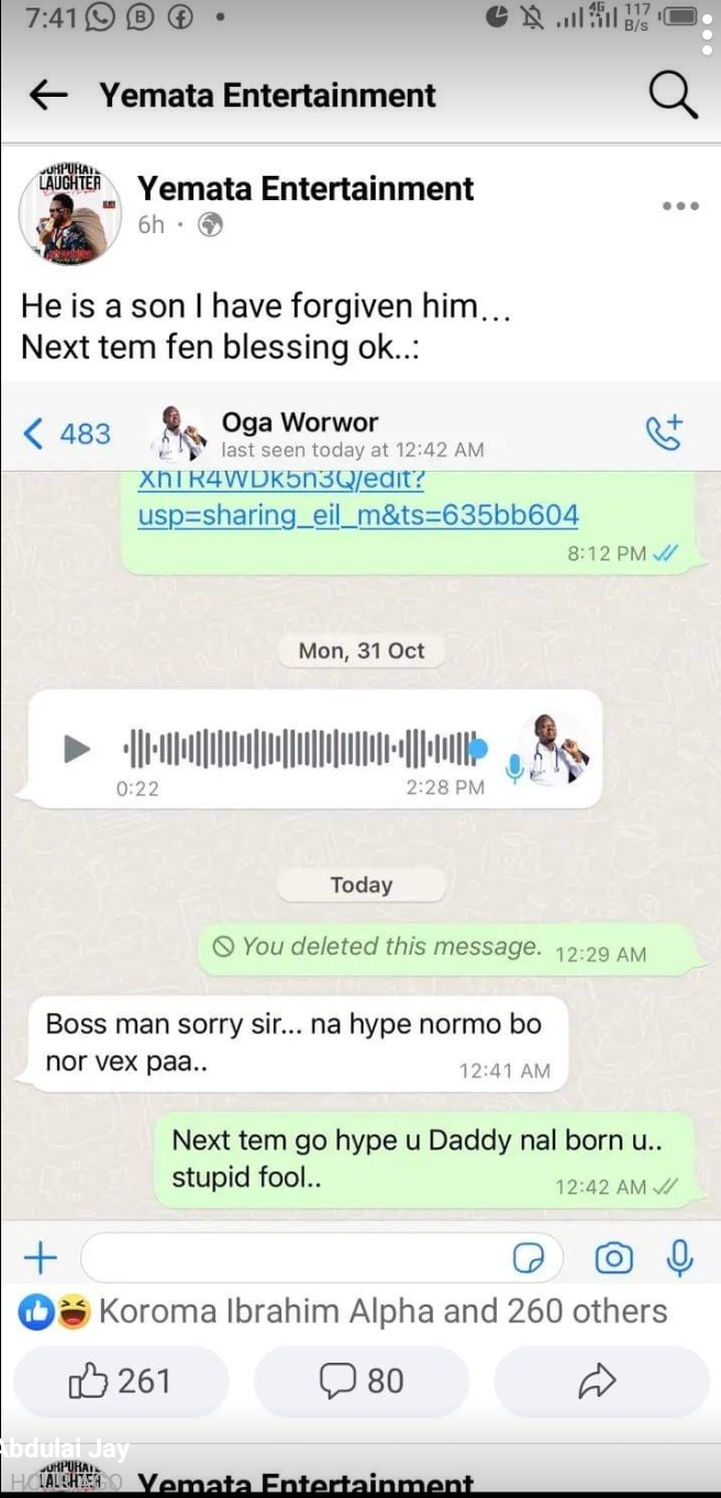 He went on to state in another post that blogger Sarah Kallay should employ Oga Worwor who is a premature and a failed comedian that wants to use his name to become popular in Sierra Leone.